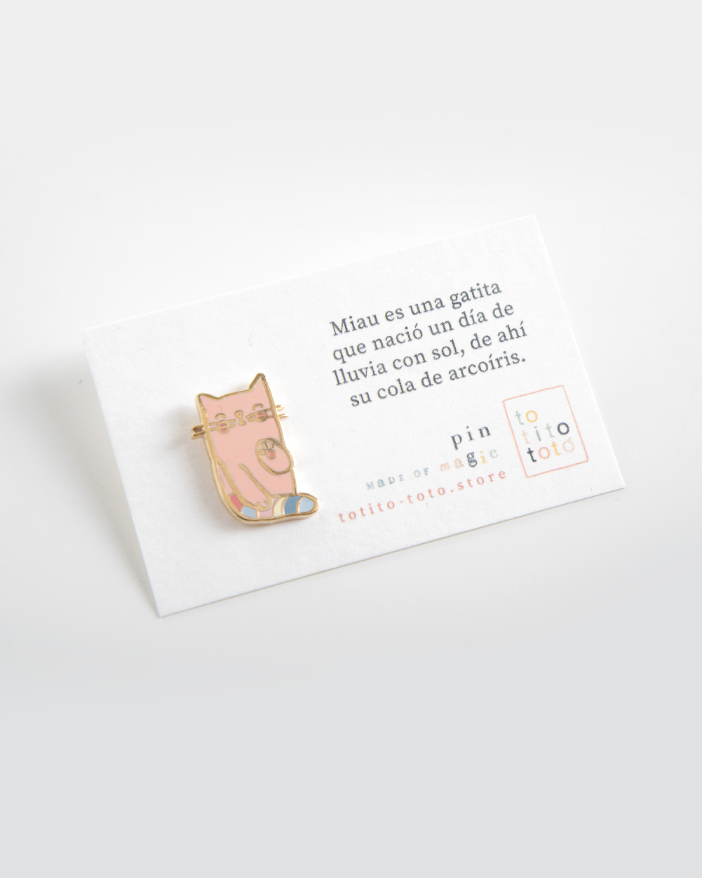 Lleva contigo un toque especial con este pin de miau la gatita con cola de arcoíris. Es perfecto para darle un brillo único a mochilas, chaquetas, bolsos o incluso a tu estuche favorito.