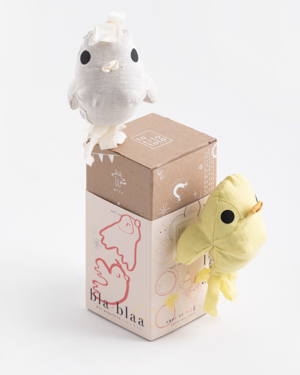 Bla Blaa son dos hermanitos pajaritos de peluche, hechos con mucho amor por manos mexicanas, utilizando tela de fibra natural 100 % algodón.Cada uno puede colgarse de distintas partes del peluche para parecer que está volando… o también pueden dormir a tu lado y cuidar de tus sueños.